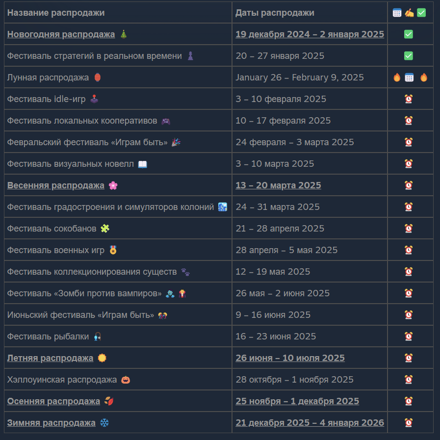 Компания Valve заранее публикует расписание всех распродаж, проводимых на площадке Steam. В 2025 году предусмотрено десятки как глобальных, так и тематических акций и распродаж. Вот частичный список грядущих распродаж на первое полугодие 2025 года: Все распродажи в Steam делятся на различные категории: Ежегодно площадка проводит четыре крупные распродажи: весеннюю, летнюю, осеннюю и зимнюю. Во время их проведения в распродаже могут участвовать все игры, размещённые в Steam. Эти акции охватывают широкий спектр жанров и проектов, предлагая игрокам выгодные скидки на популярные тайтлы и инди-игры. В рамках данных распродаж представлены игры определённой тематики или жанра, чтобы привлечь к ним внимание покупателей. Это могут быть фестивали стратегий, ролевых игр, кооперативных проектов и других категорий, что позволяет геймерам находить интересные предложения в любимых жанрах. Обычно в рамках данного фестиваля разработчики презентуют демоверсии своих будущих игр, а также проводят тематиче