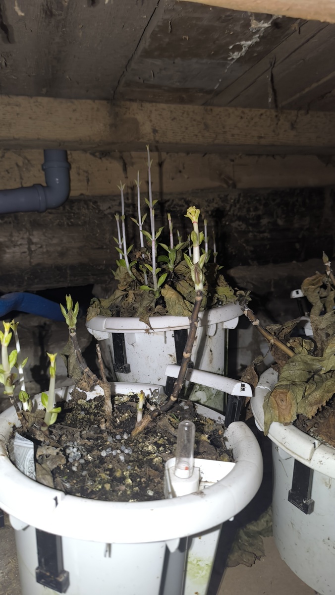 Также в подполе зимуют у нас гортензии крупнолистные. И тоже в этом году проснулись они сильно раньше чем нужно было бы. А одна ещё и цвести хочет. Вот думаю может в город на балкон холодный забрать? Тянуться бледные поганки. Но если их на свет вынуть позеленеют и окрепнут. В прошлом году весной тоже самое было правда в Апреле, а не в феврале . А вот две пока вполне себе отдыхают и расти не пытаются. И чем это обусловлено не понятно. А вот одна убранная с цветами листья потеряла но цветы как были так и остались . Фото ноябрьское этой же гортензии без имени. Так как пересорт. Кроме прочего горшки с лилиями там тоже зимуют и вот тут совсем проблема они стали прорастать. Через неделю пожалуй тоже самых шустрых на подоконник выну. Пусть уж зеленеют и дальше развиваются.
