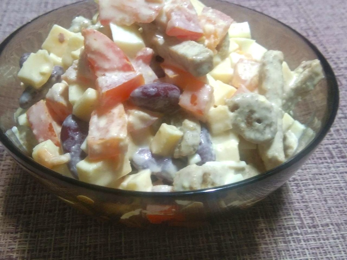 Привет, друзья! Сегодня я хочу поделиться с вами рецептом салата, который всегда вызывает восторг на столе. Этот салат не только вкусный, но и очень простой в приготовлении. Давайте начнем! Ингредиенты: - 1 банка красной фасоли (это основа нашего салата) - 5 яиц (вареных, конечно!) - 200 грамм сыра (я предпочитаю твердый, но можно и другой) - 3 помидора (сочные и ароматные) - 2 пачки сухарей (для хрустящей текстуры) - Майонез и соль по вкусу Приготовление: 1. Первым делом отвариваю яйца и даю им остыть. Затем очищаю и нарезаю их кубиками. Это как маленькие кусочки счастья! 2. Далее нарезаю сыр и помидоры также кубиками. Сыр добавит кремовости, а помидоры — свежести. 3. В глубокой миске смешиваю нарезанные яйца, сыр и помидоры. Добавляю красную фасоль, предварительно слив жидкость из банки. 4. Затем к этой вкусной смеси добавляю сухари — они придадут салату хрустящую нотку. 5. Заправляю всё это дело майонезом и добавляю соль по вкусу. Перемешиваю, чтобы все ингредиенты хорошо соединилис