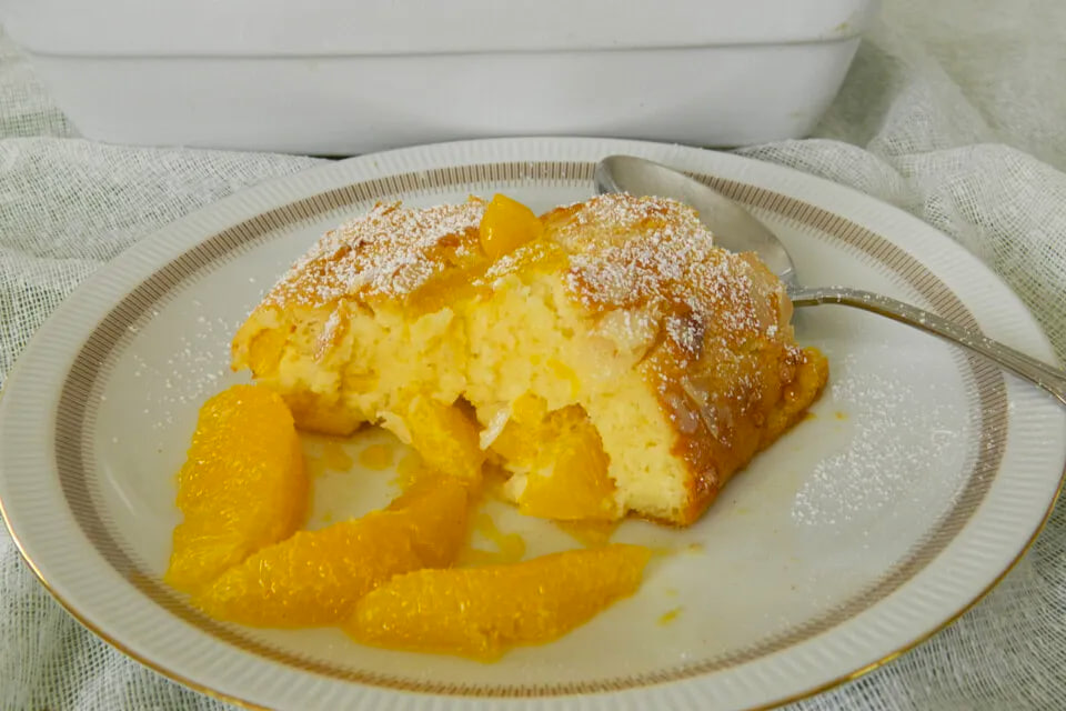 В смазанную маслом форму выливаем половину теста, выкладываем на него апельсины, заливаем остатками теста.