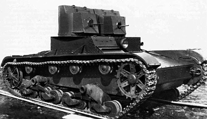 Выпускавшийся с 1931 года двухбашенный вариант танка мало чем отличался от британского прототипа. Клепанный корпус танка имел коробчатое сечение. На подбашенной коробке с вертикальным лобовым листом на шариковых опорах размещались две башни цилиндрической формы. В каждой из них предусматривалось место для одного члена экипажа, и устанавливался пулемет ДТ. Механик-водитель располагался в передней части корпуса справа. В 1932 году в правой башне вместо пулемета ДТ стали устанавливать 37 мм пушку Гочкиса с боекомплектом из 113 выстрелов. Боевая масс двухбашенного пулеметного варианта Т-26 составляла 8 т, а двухбашенного пушечно-пулеметного – 8,4 т.
