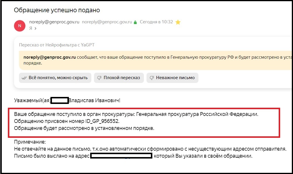 Ваше обращение поступило в орган прокуратуры 01 февраля 2025 г.: Генеральная прокуратура Российской Федерации. Обращению присвоен номер ID_GP_956552. Обращение будет рассмотрено в установленном порядке.