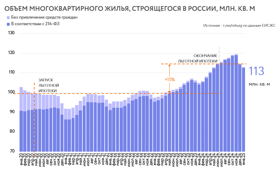 По итогам января 2025 года объем текущего строительства в группе многоквартирных домов снизился на 1,5% к предыдущему месяцу и на 5,5% к пиковым показателям прошлого года. Это можно было бы списать на сезонное снижение, но судя по всему коррекция в ближайшее время продолжится. Объем текущего строительства учитывает многоквартирные дома на разных стадиях строительства на основании данных проектных деклараций, опубликованных в Единой информационной системе жилищного строительства. В отличие от показателя ввода жилья этот индикатор свидетельствует о текущих рыночных изменениях, а не от том, как развивался рынок в предыдущие 2-3 года. По текущему строительству хорошо видно - смогла ли льготная ипотека стать "драйвером развития отрасли" в предыдущие годы. Именно такой термин очень часто использовали и представители правительства и участники рынка. «Льготная ипотека» действовала с весны 2020 до середины 2024 года и не привела к адекватному росту объема предложения в целом по стране и в