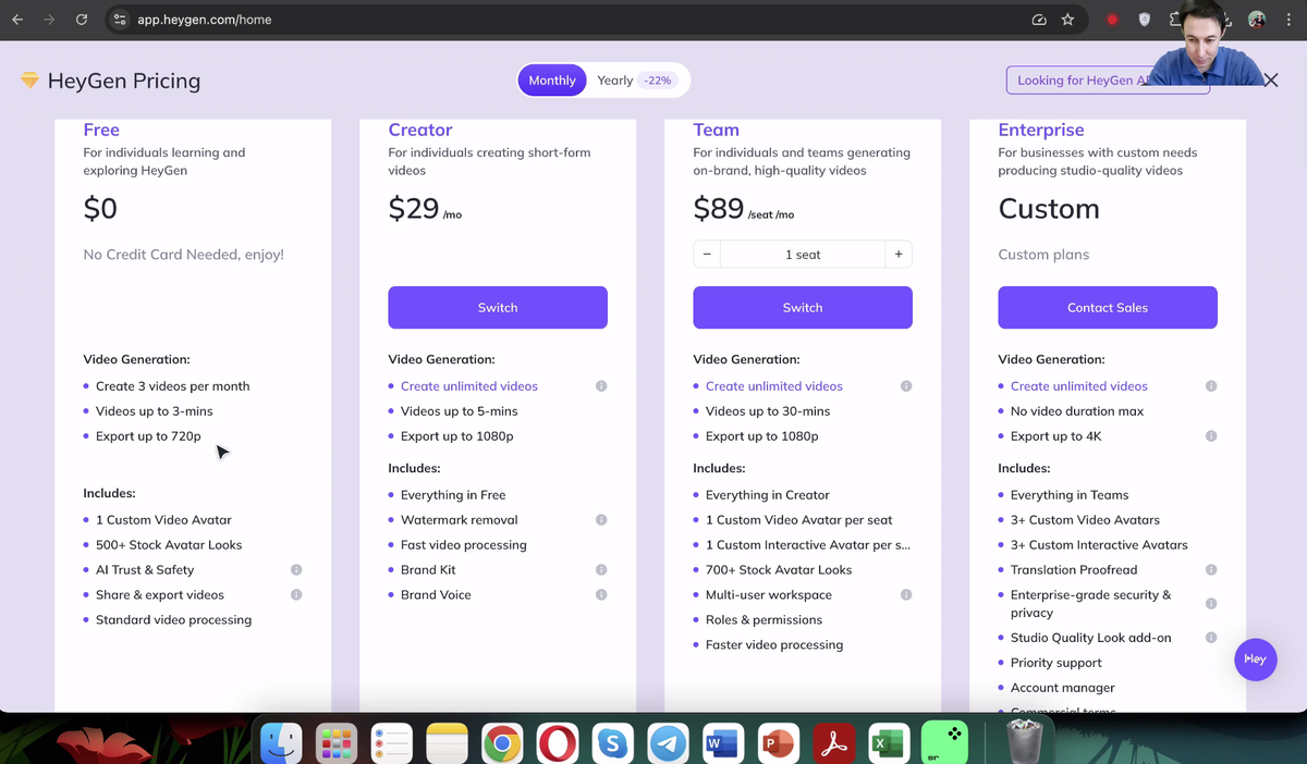 Прежде чем начать, зарегистрируйтесь на платформе HeyGen. Вы можете сделать это через электронную почту или с помощью аккаунта Google. После регистрации вы попадете в личный кабинет, где сможете выбрать подходящий тариф: