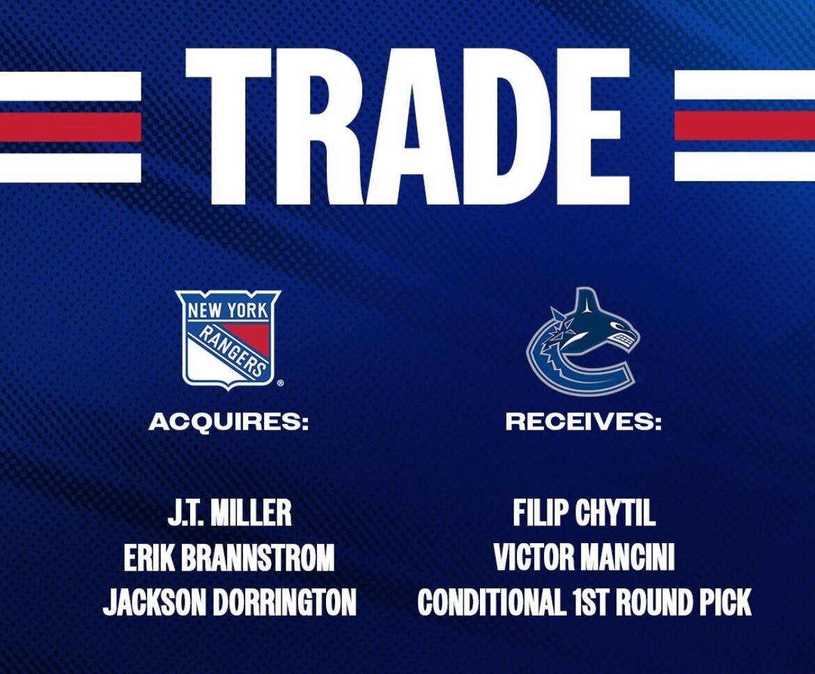 Джей Ти Миллер, Эрик Браннстрем, проспект Джексон Доррингтон —> «Рейнджерс» Филип Хитил, Виктор Мансини, условный выбор в 1-м раунде драфта-2025 (если будет в топ-13, то переносится на следующий год) —> «Ванкувер» Это трэйд, в котором я не могу назвать победителя, потому что такового может и не оказаться. «Рейнджерс» Если Миллер не станет в «Рейнджерс» проблемой, какой он был в «Кэнакс», то, конечно, это победа для Криса Друри, который из серьезных активов отдал только защищенный драфт-пик, который и так часто уходит у контендеров перед дэдлайном. Миллер заменит вечно перспективного и часто травмированного Хитила, которому уже 25 лет. На бумаге это огромный апгрэйд. Мансини также не считаю потерей. Он, скорее всего, будет игроком уровня третьей пары НХЛ. Мо-о-о-ожет быть даже второй. Но и у полученного Доррингтона почти такой же потенциал – пару месяцев назад попадались мнения на форуме канадцев, что он недооценен из-за того, что сугубо оборонительные защитники недополучают внимания от