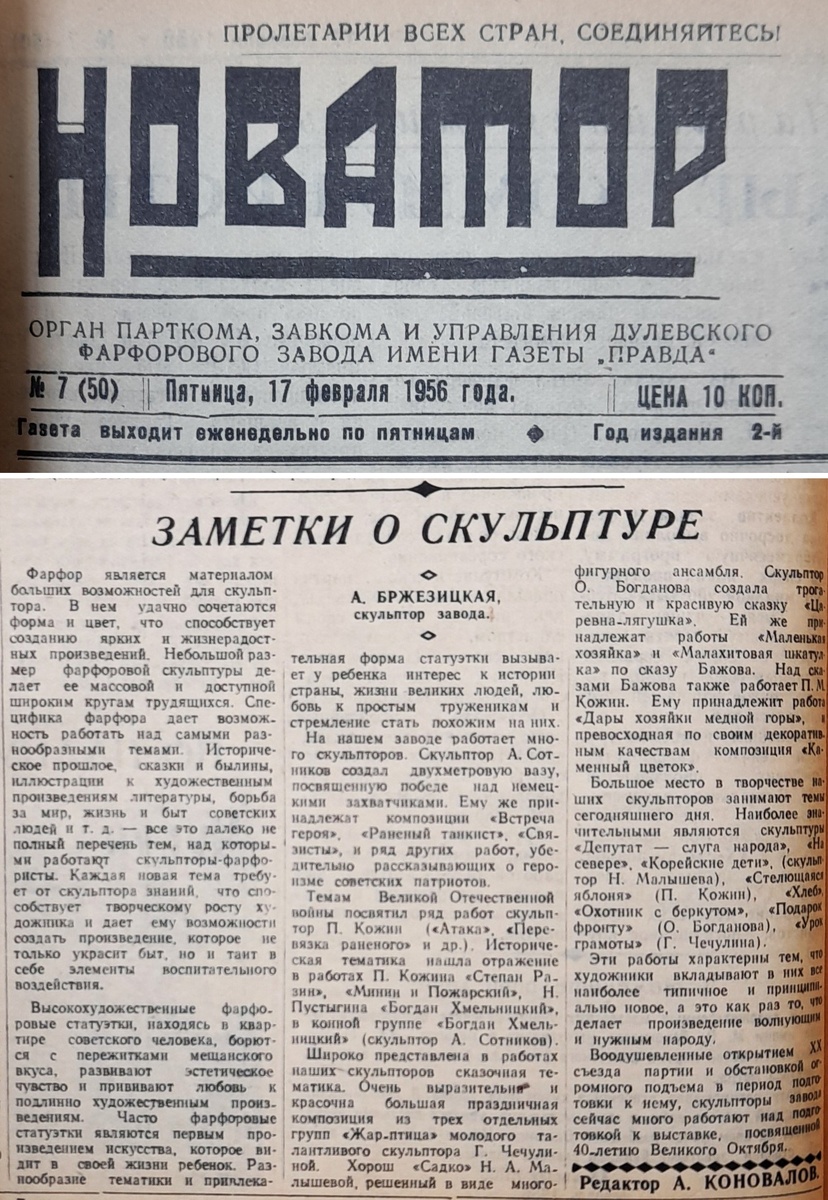 Бржезицкая А.Д. ЗАМЕТКИ О СКУЛЬПТУРЕ // Газета «Новатор», орган парткома, завкома и управления Дулёвского фарфорового завода им. газета «Правда», 1956. – №7 (50) от 17 февраля. – С. 2.