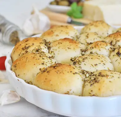 Ничто не сравнится с манящим ароматом свежеиспечённых чесночных булочек, от которого текут слюнки и просыпается аппетит. Это пряный аромат чеснока в сочетании с ароматом орегано и оливкового масла. Обязательно попробуйте приготовить эти булочки к первым блюдам. Вот рецепт чесночных булочек. Для приготовления нам будут нужны вот эти продукты: 400 г пшеничной муки 7 г активных сухих дрожжей 1 чайная ложка сахара 250 мл воды 1,5 чайной ложки соли 2 столовые ложки несоленого сливочного масла 2 столовые ложки оливкового масла 2 зубчика чеснока (или больше), пропущенных через мясорубку 0.5 столовой ложки сушеных листьев орегано. Время приготовления: 3 часа. Все нужные продукты мы собрали. Начинаем готовить вкусные дрожжевые булочки с чесноком. 1. В чашу кухонного комбайна добавьте пшеничную, быстродействующие дрожжи и сахарный песок. Несколько раз взбейте, чтобы смешать. 2. Подогрейте воду и, пока ваш кухонный комбайн работает (у меня есть режим «тесто»), добавьте примерно 3/4 стакана воды.