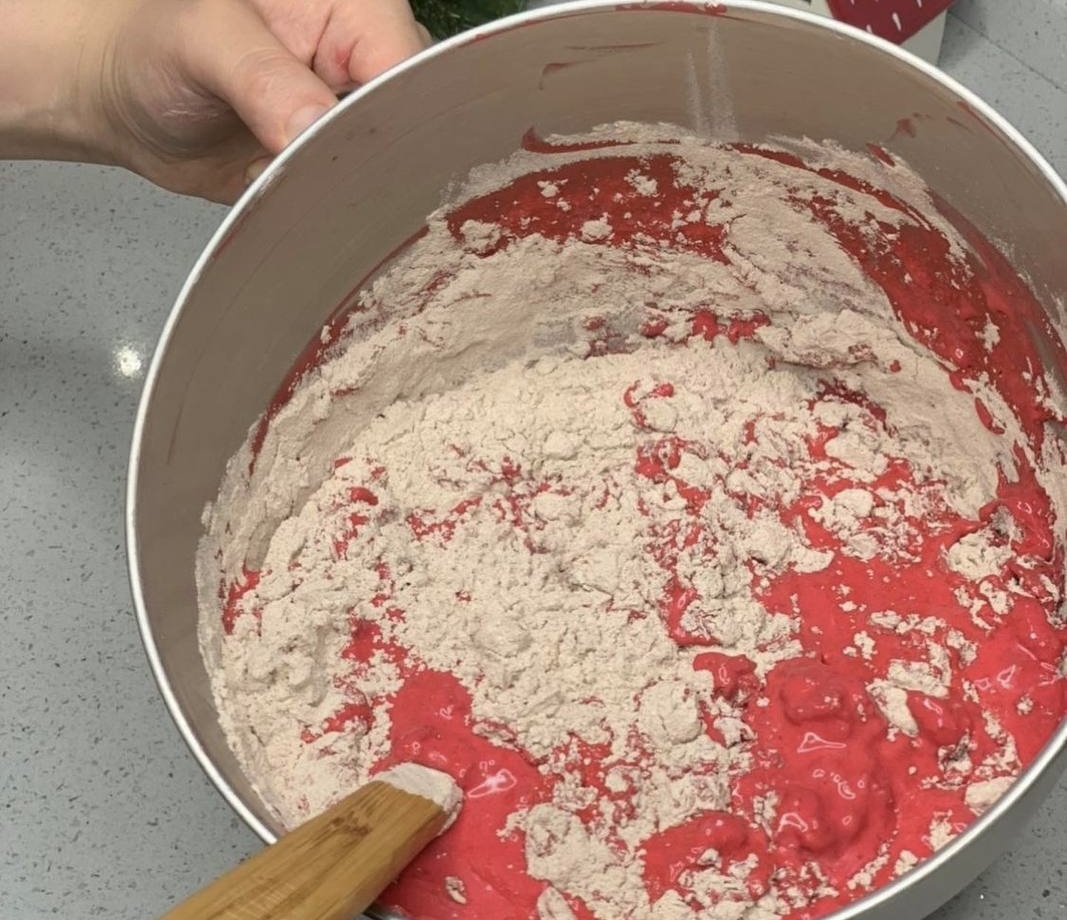 Видео рецепт по ссылке Для Бисквита "Красный Бархат" Мука - 350 гр Сода - 1 ч.л Разрыхлитель - 2 ч.л Соль - 1/2 ч.л. Какао порошок - 14 гр Масло сливочное - 100 гр Сахар - 300 гр Масло растительное - 100 мл Яйцо - 3 шт Кефир - 300 мл Краситель красный - 3 ч.л. Крем Сливки 33-35% - 500 мл Сахарная пудра - 150 гр Сыр маскарпоне - 700 гр Декор У меня посыпка от кекса , малина и голубика Приготовления Кекс: Сливочное масло взбиваем до белой пышной массы и добавляем сахар мешаем , и добавляем растительное масло Муку, какао, соль , разрыхлите и соду соединяем. Просеиваем через сито. К кефиру добавляем краситель . К нашей массе из масел и сахара, добавляем по одному яйцу и ванильный сахар взбиваем до однородности и добавляем кефир с красителем . В водим сухие ингредиенты и отправляем в духовку на 50 минут 180° Крем для прослойки Взбиваем сливки , добавляем маскарпоне и сахарную пудру , мешаем до однородности . Собираем пирожные "Красный Бархат" как на видео ✨Готово ✨ ✨Приятного Аппетита ✨