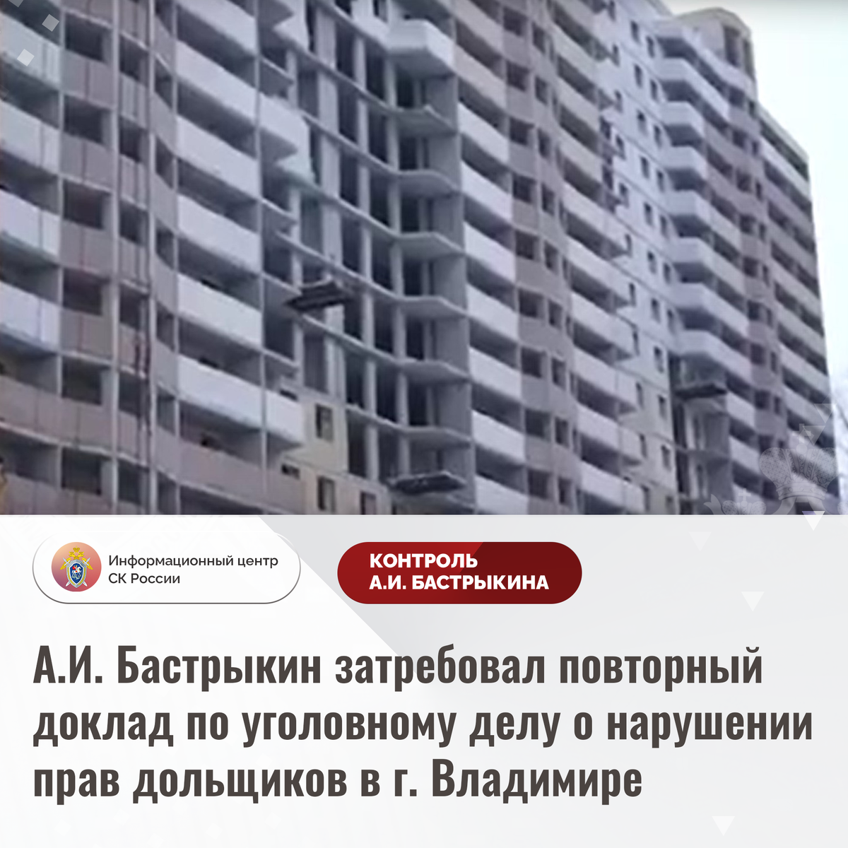А.И. Бастрыкин затребовал повторный доклад по уголовному делу о нарушении прав дольщиков в г. Владимире В комментариях в аккаунте приёмной главы СК России А.И. Бастрыкина «ВКонтакте» опубликованы обращения о продолжающемся нарушении застройщиком прав участников долевого строительства в городе Владимире. Организация приступила к возведению многоквартирного дома в 2018 году, однако до настоящего времени собственникам приобретенная недвижимость не предоставлена. В настоящее время строительство приостановлено, компания признана банкротом. Многочисленные обращения результатов не принесли. Ранее указанная ситуация освещалась в социальных сетях. В СУ СК России по Владимирской области расследуется уголовное дело, по которому А.И. Бастрыкин поручал представить доклад. Председатель Следственного комитета Российской Федерации Александр Иванович Бастрыкин затребовал у руководителя СУ СК России по Владимирской области Артема Александровича Кулакова повторный доклад о проведенном по уголовному делу