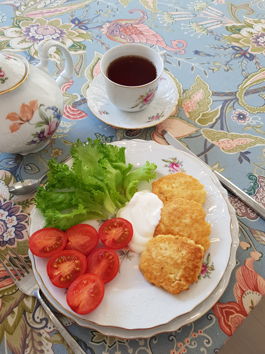 Доброе утро, дорогие друзья! Сегодня я предлагаю вашему вниманию вкусный и легкий завтрак из оладий. Вчера при разделке карпа осталась 350 грамм икры, которая и послужила основой для сегодняшнего завтрака. Для приготовления нам понадобятся: 350 грамм икры карпа, 1 яйцо, 50 грамм муки, 1/2 чайной ложки соли, 1/2 чайной ложки приправы, 3 столовые ложки подсолнечного масла. Приготовление: Икру промыть в теплой воде несколько раз, удаляя пленку. После последней промывки выложить икру в дуршлаг с марлей в 2 слоя. Дать воде стечь. Переложить икру в глубокую тарелку, добавить яйцо, соль, приправу. Перемешать. Добавить муку, перемешать. На разогретую сковороду вылить растительное масло и выложить ложкой икру, формируя небольшие оладьи. Обжарить до золотистой корочки с обоих сторон на среднем огне в течение 5 минут. На тарелки выложить промытые листья салата, оладьи и помидоры. Дополнить блюдо сметаной. Приятного аппетита!