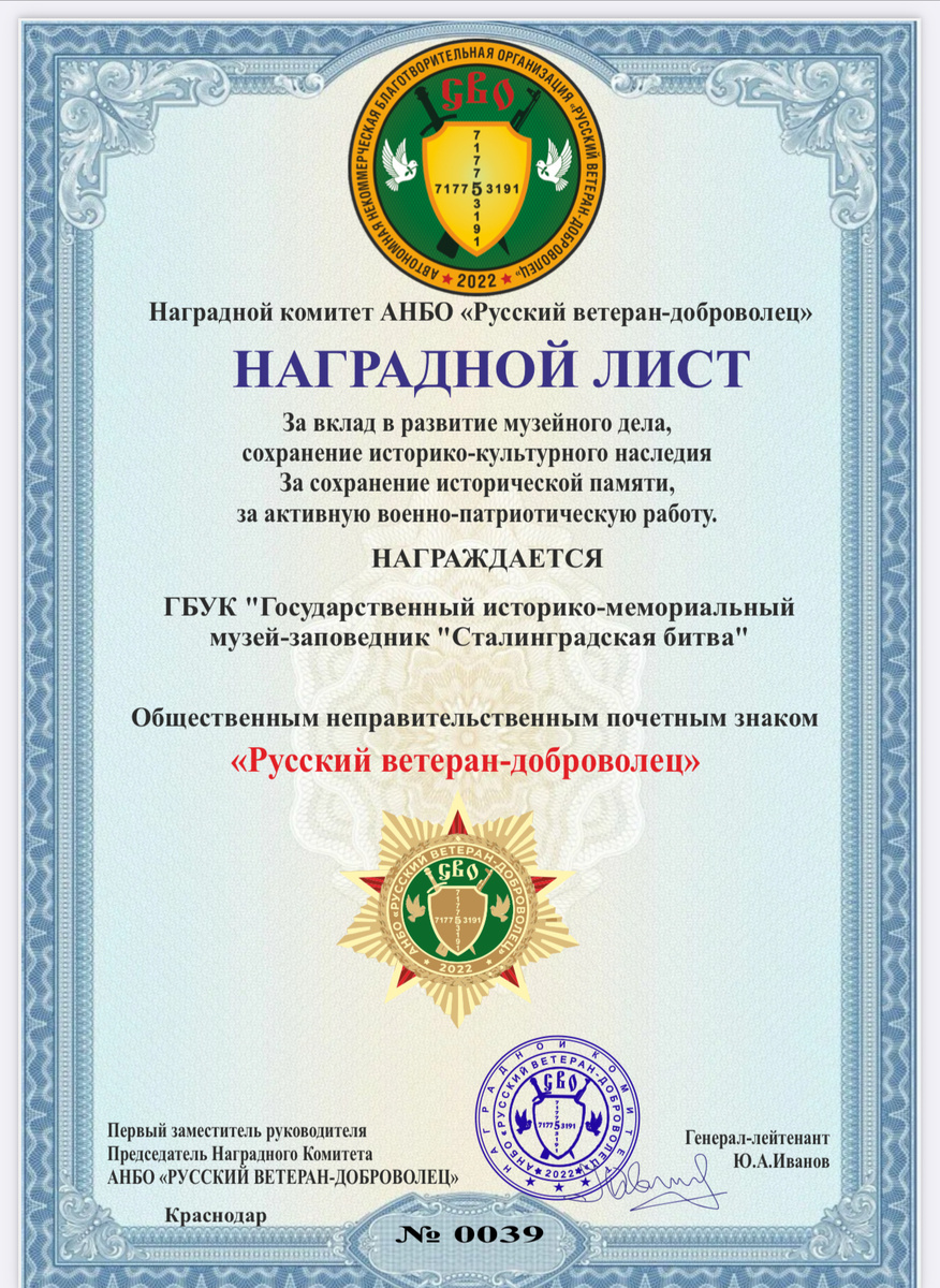 ГБУК "Государственный историко-мемориальный музей-заповедник "Сталинградская битва" Наградили почетным знаком «Русский ВЕТЕРАН-ДОБРОВОЛЕЦ»