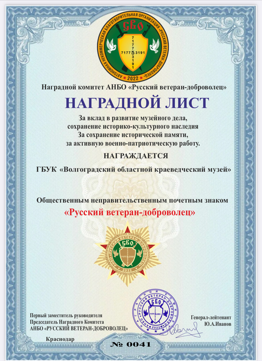 ГБУК «Волгоградский областной краеведческий музей» награждается почетным знаком «Русский ветеран-доброволец»
