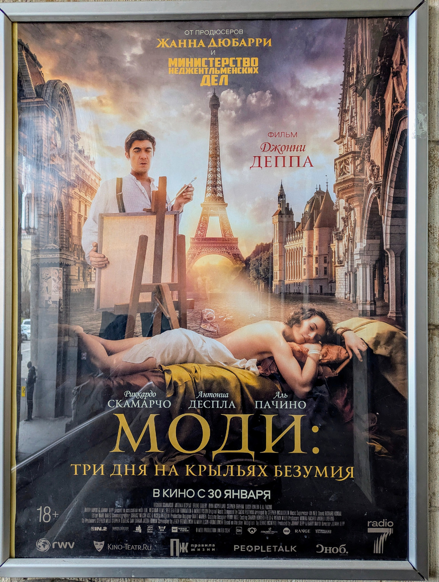 Идея начать первый день последнего зимнего месяца в кинотеатре "Дом кино" оказалась так себе. Хотя. Сама по себе идея была неплоха. Выбор фильма оказался неверным. Байопик "Моди.Три дня на грани безумия." от свежеиспечённого режиссёра Джонни Деппа. Режиссёр - сам Д.Депп! В ролях - гениальный Аль Пачино. Ну и ладно. Бог с ними, великими. Только вот роль Амедео Модильяни в фильме досталась итальянскому актёру Риккардо Скамарчи, известному мне по великолепной семейной саге "Лучшие из молодых". Здесь я устоять не смогла. А надо было. Тогда бы удалось избежать "гениальных режиссёрских находок", которыми киношедевр пронизан насквозь: лобковые вши, муха на щеке, диалоги то ли со сверчком, то ли с тараканом, маски смерти на кладбище. Друзья Модильяни - дегенерат Х.Сутин и ренегат М.Утрилло. Возможно, я неверно поняла мысль Д.Д., и Утрилло выступает здесь не ренегатом, а самым обычным кретином. Первые полчаса - чернуха чёрная, как она есть. Центральная часть ни о чём. Про Жанну Эбютерн амер