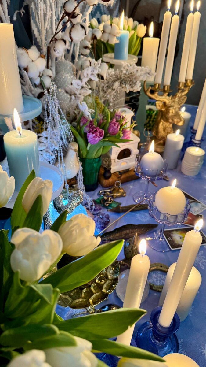 Что же такое Алтарь? Алтарь- это не набор страшных символов, а усилитель определенной энергии. Раньше алтари устанавливали в месте, где был открыт портал силы. На алтарях обязательно лежали камни, стояли идолы богов, а рядом находилась живая вода- река или родник. 🦋Сейчас вы видите мой алтарь Имболка и всю символику, связанную с чистотой,началом весны, началом года, с женской силой и силой Богини земли. Алтарь -это ваш божественный вайфай, соединение с нужными энергиями и усиление их. Кроме самой змеи символом этого года является голубь или голубка, как оберег вашего дома на весь этот год. Голуби тоже есть на алтаре. А еще свежие весенние цветы, фигурки змеи, голубые и белые свечи, мои камни и кристаллы, веретено как символ плетения полотна своей жизни. Печка- символ домашнего очага и изобилия. На алтаре не обязательно колдовать, Тут можно писать списки очищения, вести свой дневник, делать карту желаний и медитации. Алтарь работает постоянно и тран