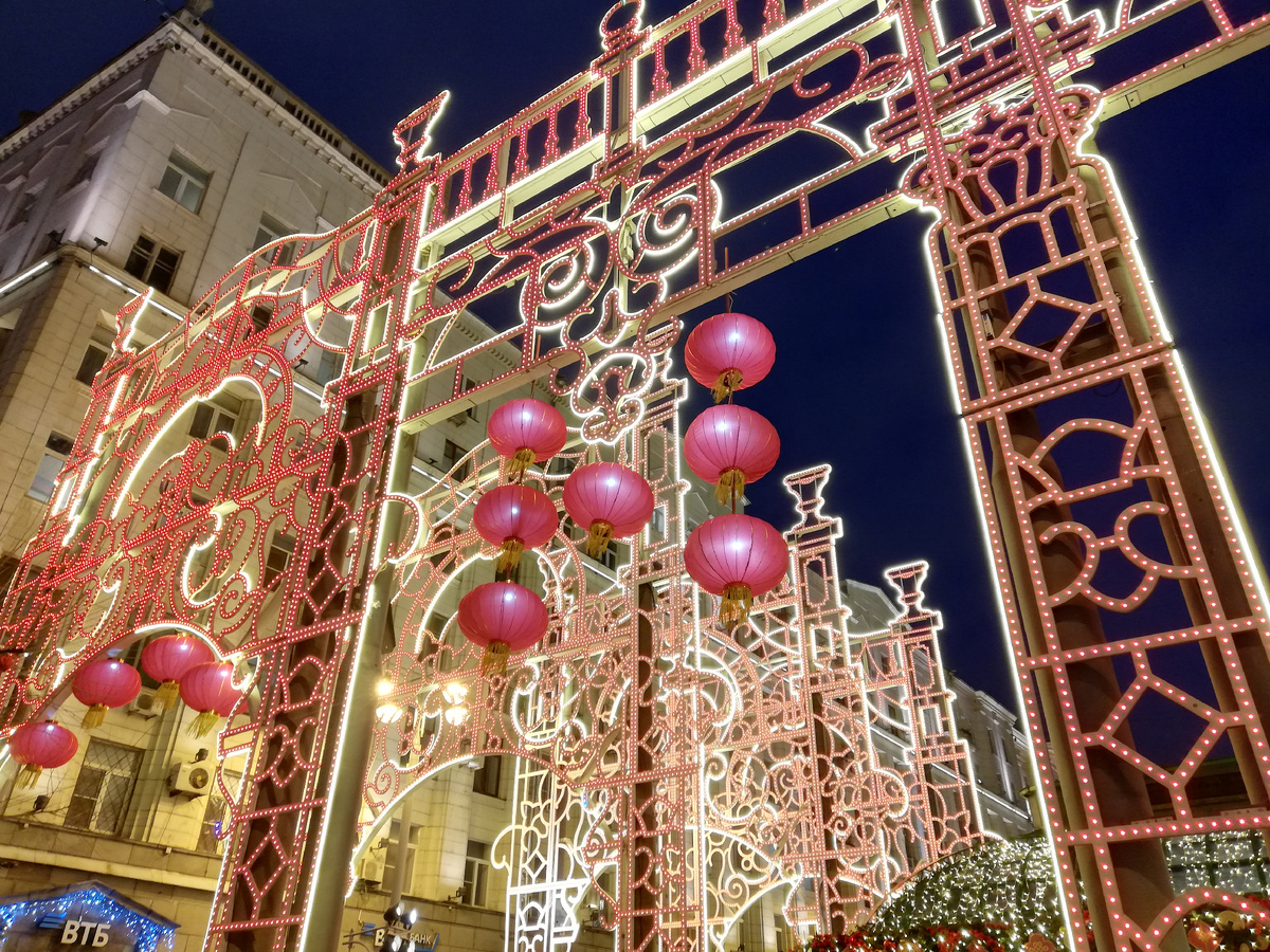 01.02.2025 В этот раз начали свою прогулку с Тверской площади. Там как всегда красочно и многолюдно. Многочисленные елки сменили наряд, и теперь они украшены в соответствии с китайскими традициями - монетами,фонариками, веерами, мандаринами, веточками сакуры. Драконы на каждом шагу, большие и поменьше, на любой вкус. И хотя посетителей очень много, сфотографироваться без посторонних в кадре вполне возможно. Все- таки москвичи - культурные люди. Повсюду на скамеечках сидят игрушечные панды, с ними фотографируются и дети, и взрослые. На сцене разыгрывается представление, но к китайцам в этот раз никакого отношения оно не имеет. В торговых палатках можно купить китайские сувениры. Я, кстати, купила очередную черепашку в свою коллекцию. Дальше мы с подругой отправились в Камергерский переулок. На входе гостей встречает огромный дракон, которого дети дергают за веревки, отчего он извивается во все стороны. За аркой - мандариновая елка. Над переулком- шикарная свето