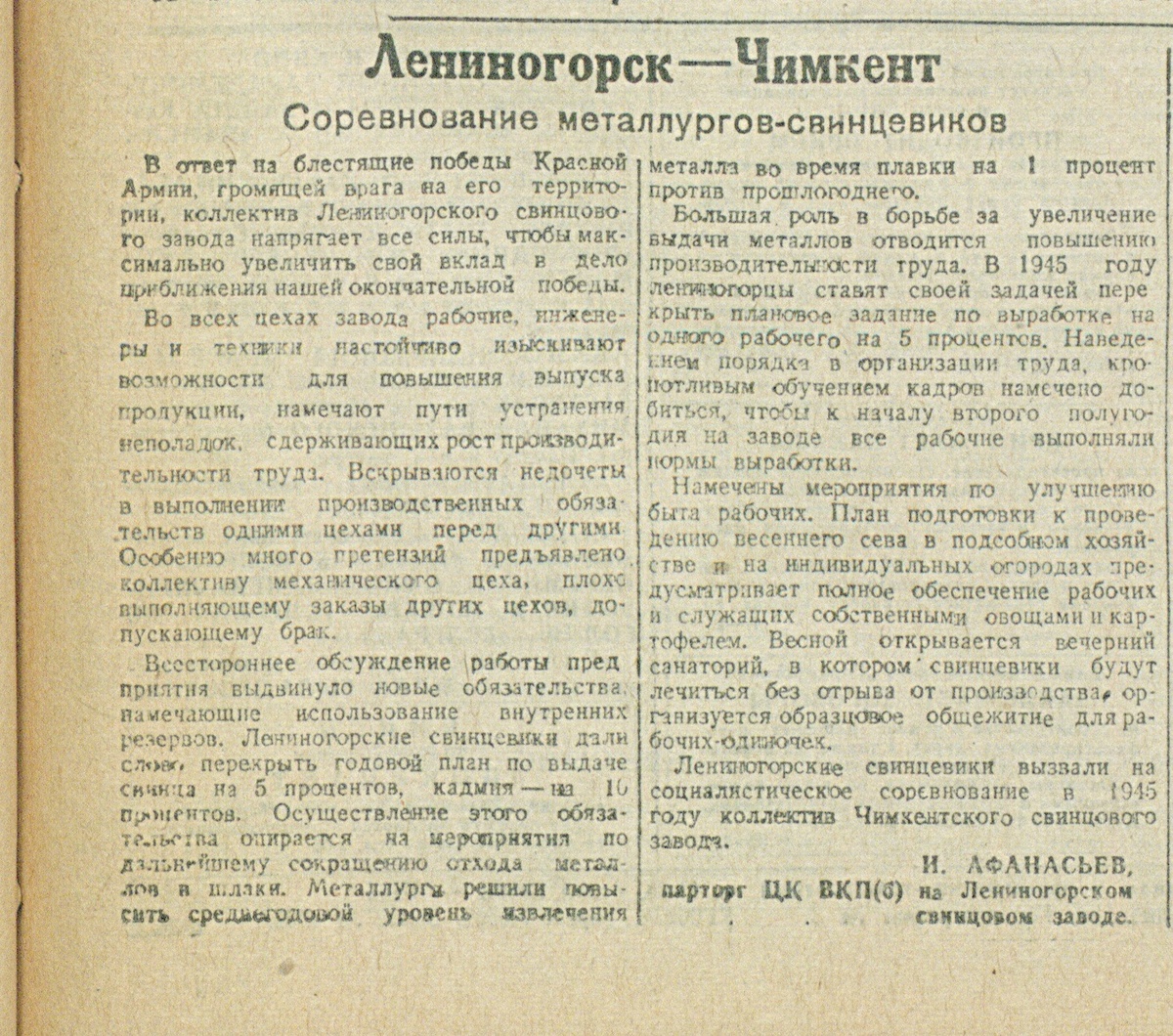 Лениногорские свинцевики вызвали на социалистическое соревнование в 1945 году коллектив Чимкентского свинцового завода.