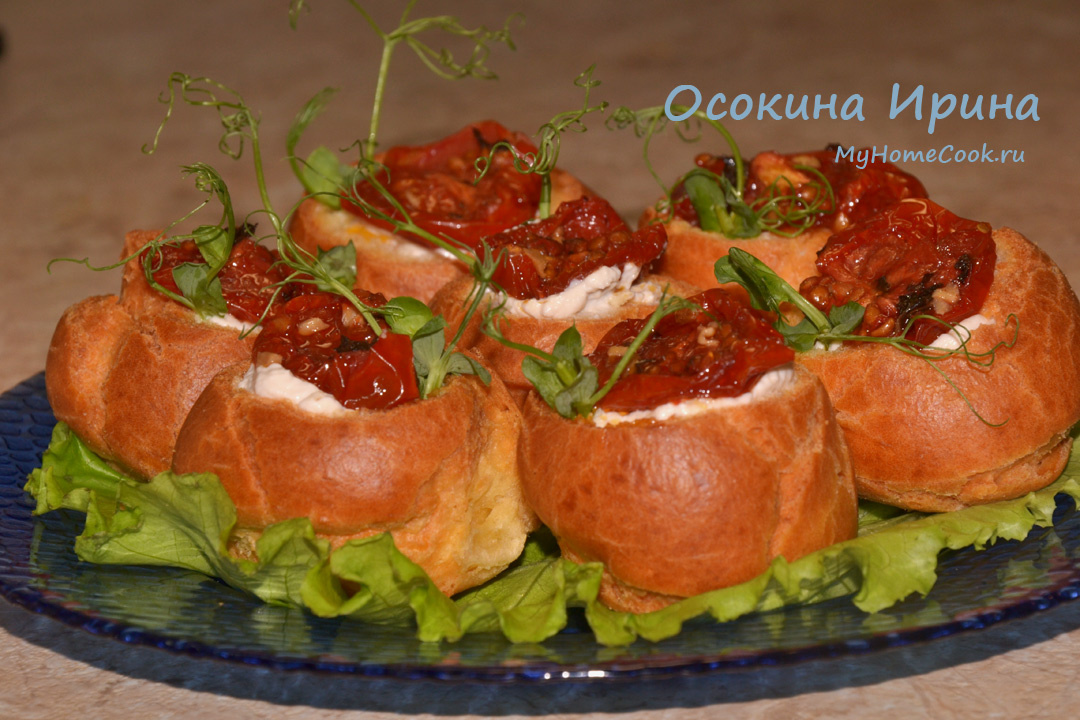 Сегодня у нас не сладкие профитроли, как обычно бывает, а профитроли на закусочные: в пиалке смешала 50 г размягчённого сливочного масла, 200 г рикотты и 1 ст.л. бальзамического уксуса, слегка взбила всё венчиком и переложила в кулинарный пакет. У готовых профитролей срезала верхушки, у кулинарного пакета срезала уголок и наполнила профитроли, накрыла срезы ломтиками вяленых томатов, украсила микрозеленью, горошка, немного настояла в холодильнике и подала. Великолепная закуска, достойная праздничного стола) Приятного аппетита