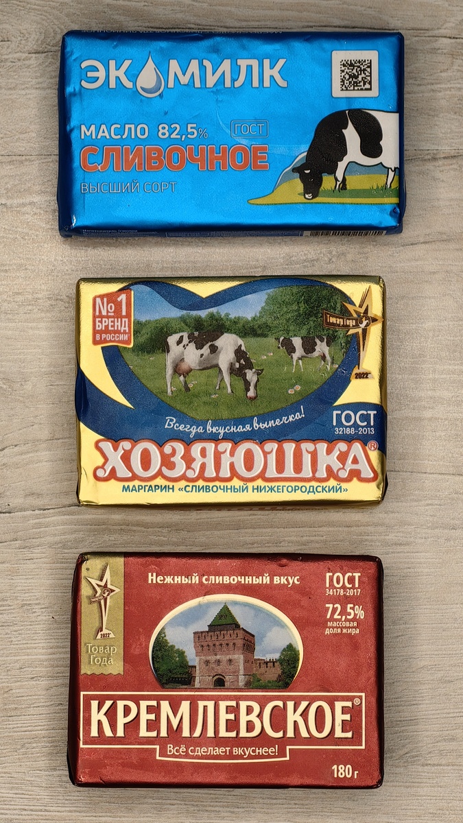 Для эксперимента я купила 3 разных продукта: масло - "Экомилк", маргарин - "Хозяюшка" и спред - “Кремлевское". Ниже оставила фото упаковок👇