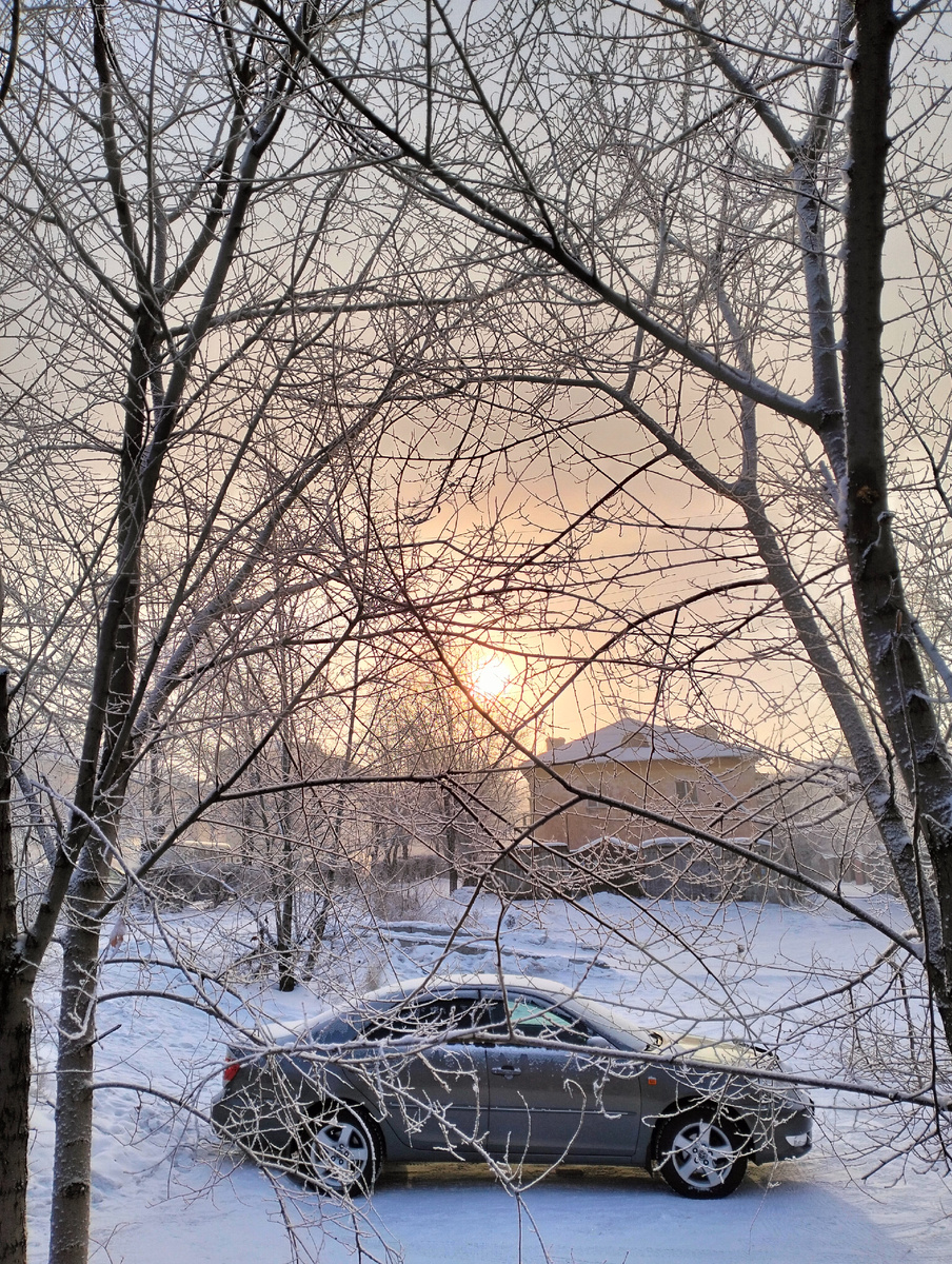 Есть, оказывается такой режим, когда вредные примеси от работы ТЭЦ, печей, автомобилей не рассеиваются в воздухе, а скапливаются и "висят" над городом. Этому способствует безветренная погода, мороз, туман, а ещё то, что наш город находится в окружении гор и холмов, в так называемой "тарелке". У нас режим черного неба объявляли уже несколько раз за последнее время. Даже на улицу выходить лишний раз не рекомендуется. Но работать-то надо. Так что хожу и фотографирую. Не такое оно и чёрное это небо) Вчера очень красиво вставало солнце над городом, яркое и оранжевое, но мне не удалось поймать самые красивые моменты - тяжёлый дым от ТЭЦ то и дело скрывал солнце, а потом оно стало почти обычным. Но немного фотографий все же получилось. Потом очередное везение - удалось увидеть свиристель и снять ее на смартфон. Так близко мне это нынче делать ещё не доводилось. Про этих очаровательных прожорливых птиц я напишу отдельно, уж очень много материала у меня накопилось про их проделки) Но до чего