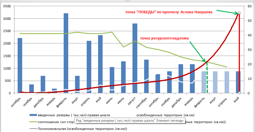 В основе моей модели надлома по главному ресурсу и прогноза победного окончания войны лежат базовые данные: цифры движения главного ресурса воюющих сторон включающие потери и пополнение, количественный показатель ввода резервов ( сейчас это актуально только для ВС РФ, так как у противника резервов не осталось) и площадь освобождаемых территорий. К 1 февраля поступило много новой информации, корректирующей ранее внесенные базовые данные , в первую очередь по потерям у противника ( они оказались меньше расчетных) и освобождаемых площадей ( зимой они также оказались меньше расчетных) . Ранее в моей системе уравнений не было постоянной - сезонного понижающего коэффициента при новой наступательной тактике российских войск ( смотрите подробно статью о ней здесь). Сейчас я его ввел. После внесения этих изменений, модель по времени наступления надлома и соответственно мой прогноз по моменту полной победы изменились. Теперь это конец февраля и конец мая соответственно . Собственно,
