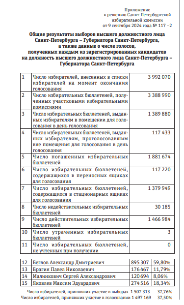 8 сентября 2024 г.состоялись выборы губернатора Санкт Петербурга. Согласно данным избирательной комиссии ( https://cdn.spbdnevnik.ru/uploads/archive/attach/2555/816fdb84e0.pdf стр. 4) Из общего числа избирателей 3 992 070 в голосовании приняло участие 1 497 169, т.е 37,5% Агитация за участие в выборах и рекламирование заслуг действующего губернатора была очень широкой, вплоть до того, что избирательные участи открыли в садоводствах. Ничего не помогло. От участия в голосовании отказалось 62,5% избирателей, а за губернатора проголосовало 895307 избирателей или 22,4% от их общего количества. Если принять во внимание, что по данным Росстата, численность пенсионеров в Санкт-Петербурге в 2024 году составляет 1 445 000 человек ( https://gogov.ru/pensioners-ru/spb ), учитывая традиционную активность участия пенсионеров в выборах и сравнивая их количество с количеством проголосовавших (1 497 169 человек), напрашивается неутешительное предположение – почти все не пенсионеры бойкотировали и