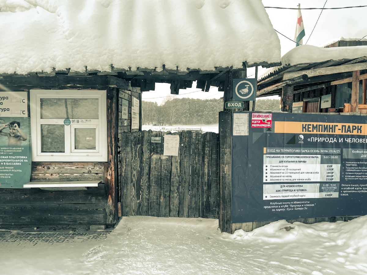 Рядом с берегом стоит небольшая деревянная раздевалка, выкрашенная в белый цвет, разделенная перегородкой на две части: мужскую и женскую. В каждую половинку ведет отдельная дверь. Внутри скудная обстановка: в комнатах стоят неказистые лавки, а на стенах висят крючки под одежду. В помещениях холодно и тихо, как в ледяной пещере. Фасадная часть раздевалки застеклена и внутри завешана тонкими занавесками высотой примерно по шею. Раздеваясь, гость может в окна глядеть на озеро. На снегу, вблизи с кромкой берега, стоит большая красивая лавка из темного дерева длинной метра три. На нее кладут полотенца перед тем, как зайти в воду, чтобы возвращаясь обратно поскорее обтереться.