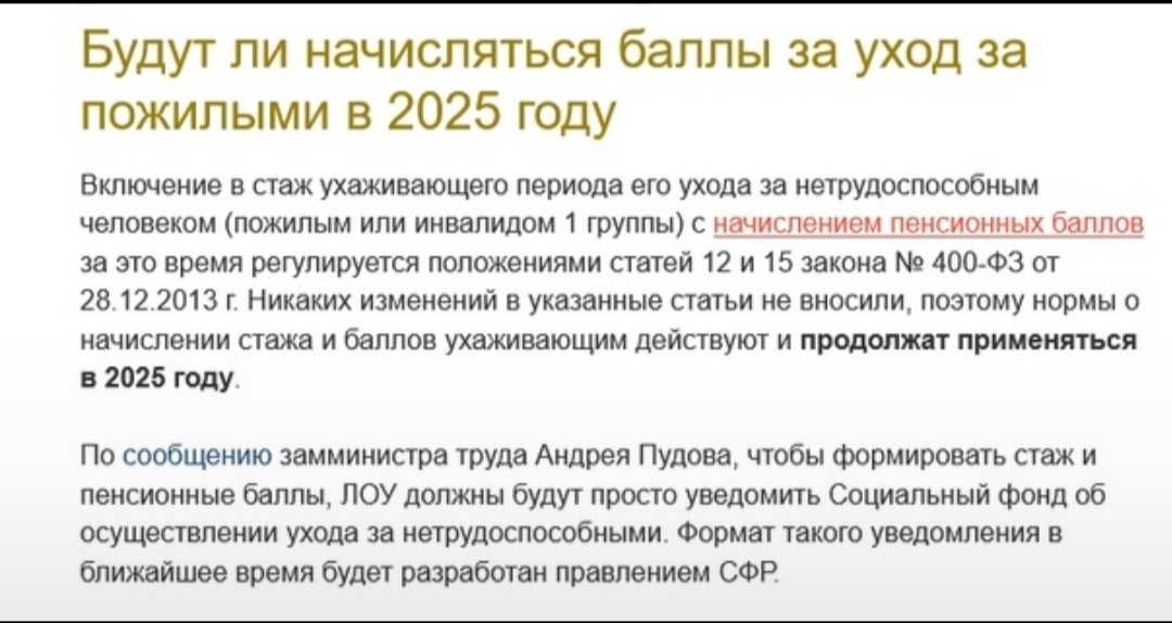 С 01.01.2025 года вступили изменения в законодательстве по уходу за инвалидами с детства, детьми инвалидами 1 группы и лицами достигшим возраста 80 лет. Теперь инвалиды с детства и дети инвалиды 1 группы выводятся в отдельную категорию и выплаты им повышают до 10 тыс руб плюс районный коэффициент. Лица достигшие 80 лет и инвалиды 1 группы, а также пенсионеры нуждающиеся в уходе по медицинским показаниям теперь получают ежемесячно доплату 1200 руб. Которая теперь индексируется ежегодно и выплачивается всем подходящим под эти критерии пенсионерам не зависимо оформлен на них уход или нет. Теперь для ЛОУ - лицо осуществляющие уход: За 24 год СФР засчитает уход всем кто осуществляет уход. С 25 года прекращается компенсационная выплата в размере 1200 руб/мес ухаживающими. С 25 года продолжают начисляются баллы в размере 1,8 балла/год. Также с 25 года СФР продолжает начислять стаж за уход. Но если раньше нужно было один раз оформить уход и ежегодно получать плюшки, теперь всё усложняется