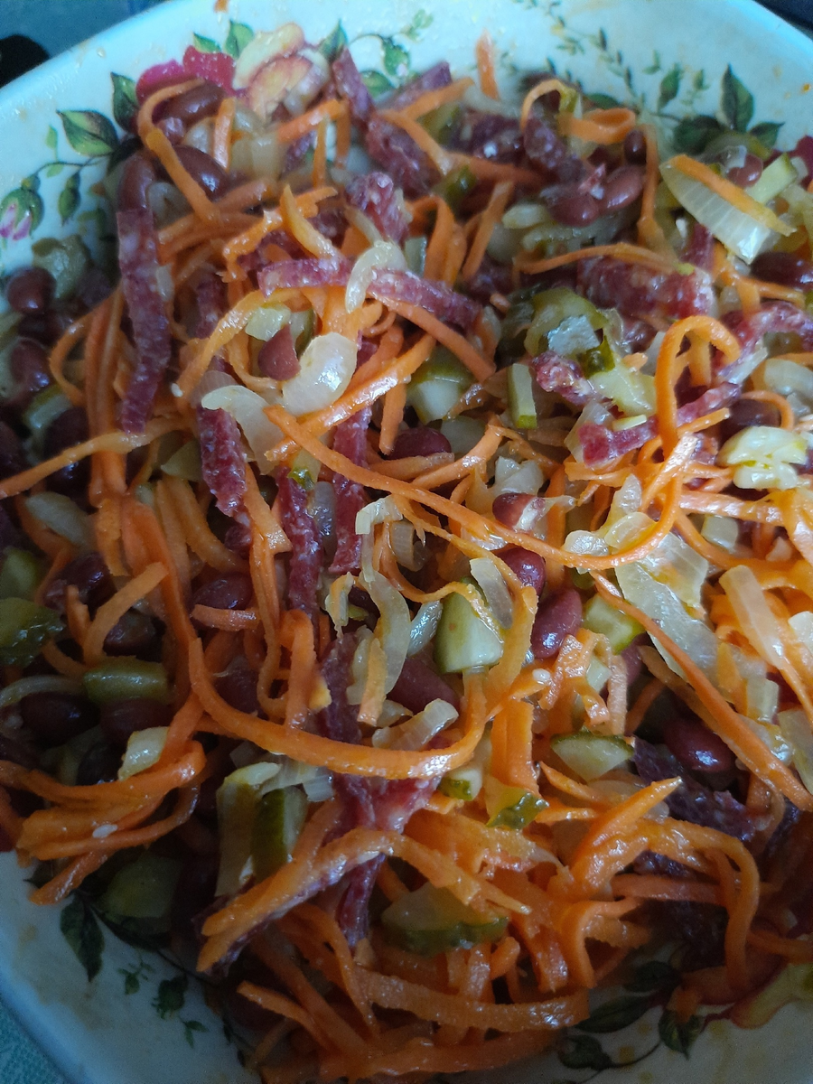 Фасоль из банки, солёный огурец, морковка по -корейски, жареный лук, копчёная колбаса.
