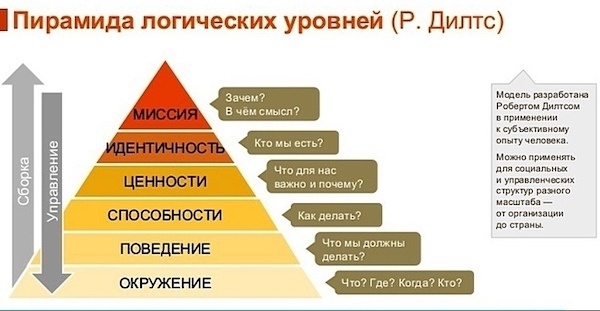 Разумеется, самый простой и правильный способ – это обратиться к хорошему коучу. Но хорошие коучи — существа редкие, и их услуги стоят иногда довольно дорого. Впрочем, я настоятельно рекомендую, по крайней мере один раз, это сделать. Хотя бы для того, чтобы осознать, насколько быстро такие затраты окупаются. Однако, если хорошего коуча рядом не случилось, и в доме пропал интернет, и нет возможности воспользоваться скайпом или вы вообще считаете, что весь этот коучинг — сплошной лохотрон, тогда можно воспользоваться одной из технологий, пришедших к нам из нейролингвистического программирования. Речь идет о знаменитой пирамиде Роберта Дилтса, которая позволяет разложить по полочкам если не все, то многое. Судя по всему, мы устроены так, что воспринимаем мир последовательно. Сперва - мы видим и осознаем, что нас окружает. Потом — что с этим можно делать. Потом — что с этим можем сделать лично мы, какие у нас в этой связи появляются возможности. И так далее — вплоть до того, зачем мы вообще пришли в этот мир. Ниже приводится описание этой техники, но я все равно рекомендую воспользоваться помощью какого-нибудь приятеля (который будет задавать вопросы) и диктофоном (чтобы потом все это прослушать и не отвлекаться на записывание ответов). В конце концов, даже хороший секс требует, как минимум, двоих и некоторой сосредоточенности на процессе. А тут мы зачинаем целый бизнес.