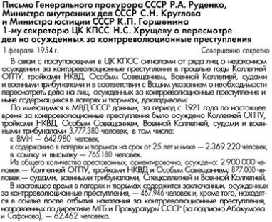 Но вот подозревать приспешников хрущёва в преуменьшении реальных масштабов "сталинских" "репрессий" – это чистейшей воды абсурд! Хотя антисоветчики действительно не жалуют этот документ, делая вид, что его не существует.