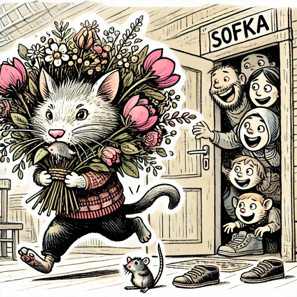 Как-то раз Софка несла добро: немножко добра для себя и побольше – для всех. Она редко баловала своих людей, но подвернулся удобный случай одарить их одним из тех невкусных растений, которые они так обожают. И вот она спешит домой с огромным букетом, который совершенно случайно прикрывает небольшую контрабанду. Но это, конечно, вторично, главное – доставить радость. Старания Софки увенчались успехом: едва подойдя к дому, она была замечена и прижата к сердцу. Радость была доставлена по адресу и пришлась по вкусу, судя по соковыжимательности объятий. Но главное – ее личное добро осталось незамеченным. Отпущенная на свободу, Софка счастливо потрусила по коридору. Как вдруг услышала позади себя некое волнение. Увы! Как ни мала была ее игрушка, у нее имелись выдающиеся детали, которые свешивались из закрытой пасти. Софка вновь оказалась в любящих руках, на этот раз вытянутых на полную длину. Было очевидно, что ею хотят похвалиться. Судя по звукам и телодвижениям гостей, добиться нужного эфф