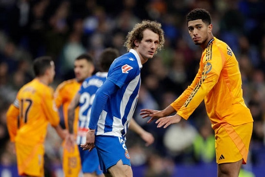 Ромеро закрыл левый фланг обороны "попугаев", а Гонсалес составил компанию Кралу и Лосано в центре поля. На острие вышел Роберто Фернандес. У гостей вновь экспериментальная оборона с Чуамени и Рюдигером в центре. Гарсия и Васкес на флангах. Себальос и Вальверде расположились в опорной зоне. Уже на первой минуте бомбардир хозяев Пуадо расчехлил пушку издали, но в створ не попал. Дальше игра увязла в середине поля. "Эспаньол" постепенно жался всё ниже, но с боем отдавал каждый метр своей половины поля. На исходе трети тайма "Реал" потерял последнего центрального защитника – Рюдигер на ровном месте получил повреждение, вынужденно уступив место Асенсио и сделав центр еще более уязвимым. "Попугаи" осмелели – Каррерас сместился справа к дуге, откуда пробивал низом. Куртуа в броске забрал мяч. В середине тайма наседавший "Реал" отправил мяч в сетку. Это Мбаппе выложил мяч под удар Винисиусу, закрутившему его под стойку, однако Килиан после паса откровенно завалил Лосано, и гол отменили. Следом уже самому Мбаппе досталось, однако подача Родриго со штрафного адресной не получилась. На исходе получаса игрового времени поддержавший атаку Васкес вошел в штрафную, переложил под левую и хлестко пробил, но попал в Кабреру. Минутой позже Винисиус рухнул в штрафной, но падения бразильца давно уже не впечатляют судей. Спасибо, что без очередного "горчичника" за симуляцию. Лишь за несколько минут до перерыва "сливочные" наиграли на первый чистый удар в створ – это Беллингем пальнул в касание от линии штрафной. Справился Гарсия. В концовке тайма еще пару угловых "Реал" получил, но и тут "попугаи" отбились, сохранив нули к перерыву.