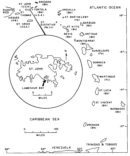 День добрый! В первой части цикла мы разобрали по деталькам, процессам и узлам всё, связанное с устройством и строительством подводной станции станции. Статья вышла шикарной и я рекомендую с ней обязательно ознакомиться. В этой части разберем картографию проекта, где что было расположено и как доставлялось. Карта №1. Местоположение эксперимента можно легко определить по картам, которыми снабжены все источники по этой теме, это архипелаг Американских Виргинских островов, а именно остров Сент Джон. На его юге располагалась бухта Lameshur, так и была установленная станция. Карта №2. Объект был установлен на границе рифа, немного поодаль стояла баржа, на берегу установили пункт связи, а лагерь располагался уже немного даже в глубь острова. Карта №3. Снабжение миссии с острова Сент Томас, крестик- станция. Карта №4. Схема рифов, где производились водолазные работы в процессе исследований. Карта №5. Более подробная карта. Тут мы видим, где располагалась база, именно около неё располагала