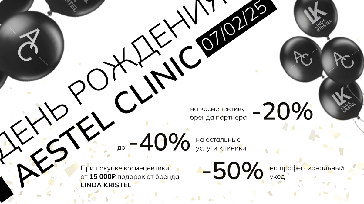 Приглашаем Вас присоединиться к нам 7 февраля 2025 года и отпраздновать День Рождения Aestel Clinic в атмосфере красоты и вдохновения! Этот день станет для Вас уникальной возможностью насладиться особыми предложениями и приятными сюрпризами.