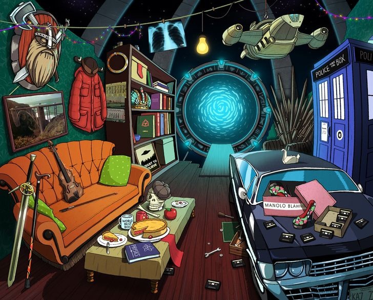 Перед тобой — фантастисеская иллюстрация, где художник спрятал 25 известных сериалов. Среди них: