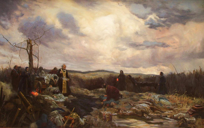 И горели кости князей и герцогов и остатки эскадронов и обломки оружия с зари вечерней до утренней, и солнце застало поле Бородинское поседевшим от пепла костей человеческих. Прошла зима. Теплые весенние дожди напоили окрестности Можайска, и высоко росли травы и прозябения на местах великого побоища. Поселяне говорили между собою:Земля наша стала сыта!". А чиновники местной полиции, сверяя донесения сотских, сельских старост и волостных писарей, выводили валовый итог:1812-го года, декабря 3-го, всех человеческих и конских трупов на Бородинском поле сожжено: девяносто три тысячи девятьсот девяносто девять".