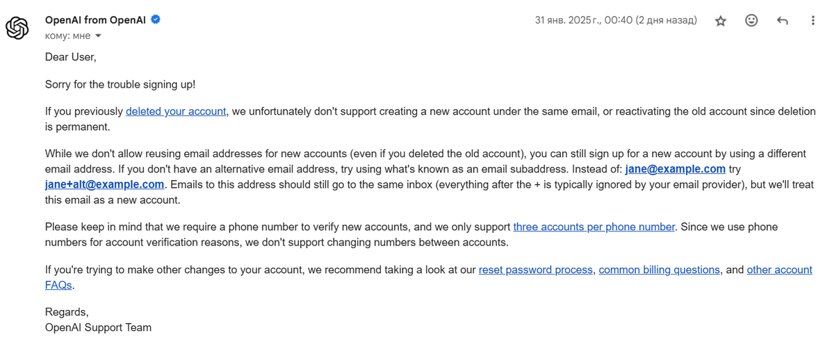Если ваш аккаунт ChatGPT заблокировали (как мой, после двух лет тренировок - описала эту душещипательную историю в статье здесь - "ChatGPT заблокировал мой аккаунт. 2 года жизни впустую?"), а заводить новую почту не хочется — есть способ избежать лишних ящиков. Официальный ответ поддержки OpenAI: можно использовать «плюс-алiасы» в email.