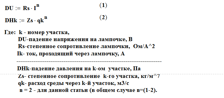 Идея моделировать гидравлические схемы на электрических лампочках провалилась по разным причинам и сейчас я вспомнил американцев только по одной причине: с точки зрения математики формулы (1) и (2) очень похожие . Поэтому, если будет необходимость решать сложную электрическую схему, в состав которой входят электрических лампочки, то неплохо узнать, что алгоритм решения такой задачи опубликован ещё в 1975 году в журнале "Электрические станции" №12, стр.24-(л.1). Что бы читателю не пришлось искать эту литературу ниже приводится краткий вывод этой формулы. Более поздние публикации формулы приводятся далее в списке литературы.