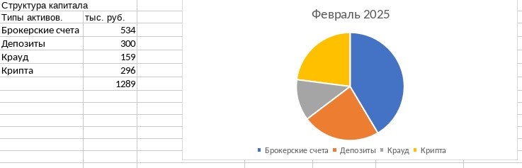 Третий ежемесячный пост со структурой моего капитала. Структура на 02.02.2025: Структура к которой стремлюсь: 50% брокерские счета (акции, облигации, фонды)