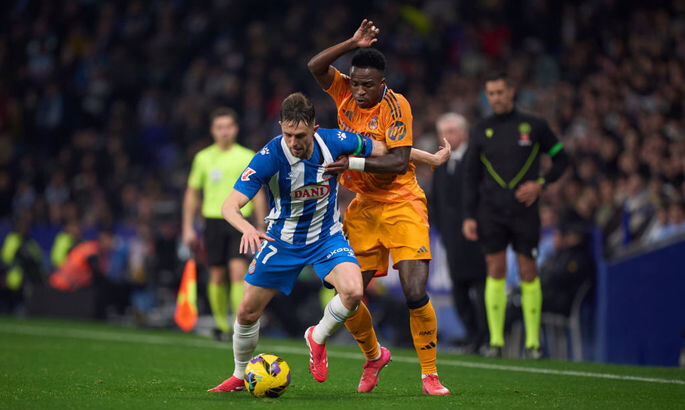 Перед матчем у обеих команд были определенные кадровые проблемы. У "Реала" не могли играть травмированные Милитан, Карвахаль и Камавинга. У "Эспаньола" пропускали игру травмированные Хосе Грагера, Пабло Рамон, Оливан. В первые 10 минут на поле ничего интересного не происходило. Мадридцы больше контролировали мяч, но никаких дивидендов им это не давало. Первый действительно опасный момент создали гости. Винисиус совершил подачу в штрафную, а Беллингем не сумел добраться до мяча и столкнулся с голкипером. На 15 минуте повреждение получил Рюдигер, которого заменил Асенсио. Сразу же Рауль чуть не замкнул подачу Родриго с правого края, но акцентированного удара не получилось, ведь мяч попал в плечо защитнику "Реала". На 18-й минуте первый опасный момент создали хозяева. Это Хофре пробил с предела штрафной в нижний правый угол ворот, но Тибо Куртуа легко справился с ударом. В середине тайма Винисиус обыграл двух защитников и пробил в дальний угол. Шикарный гол…. мог бы быть, если бы не фол