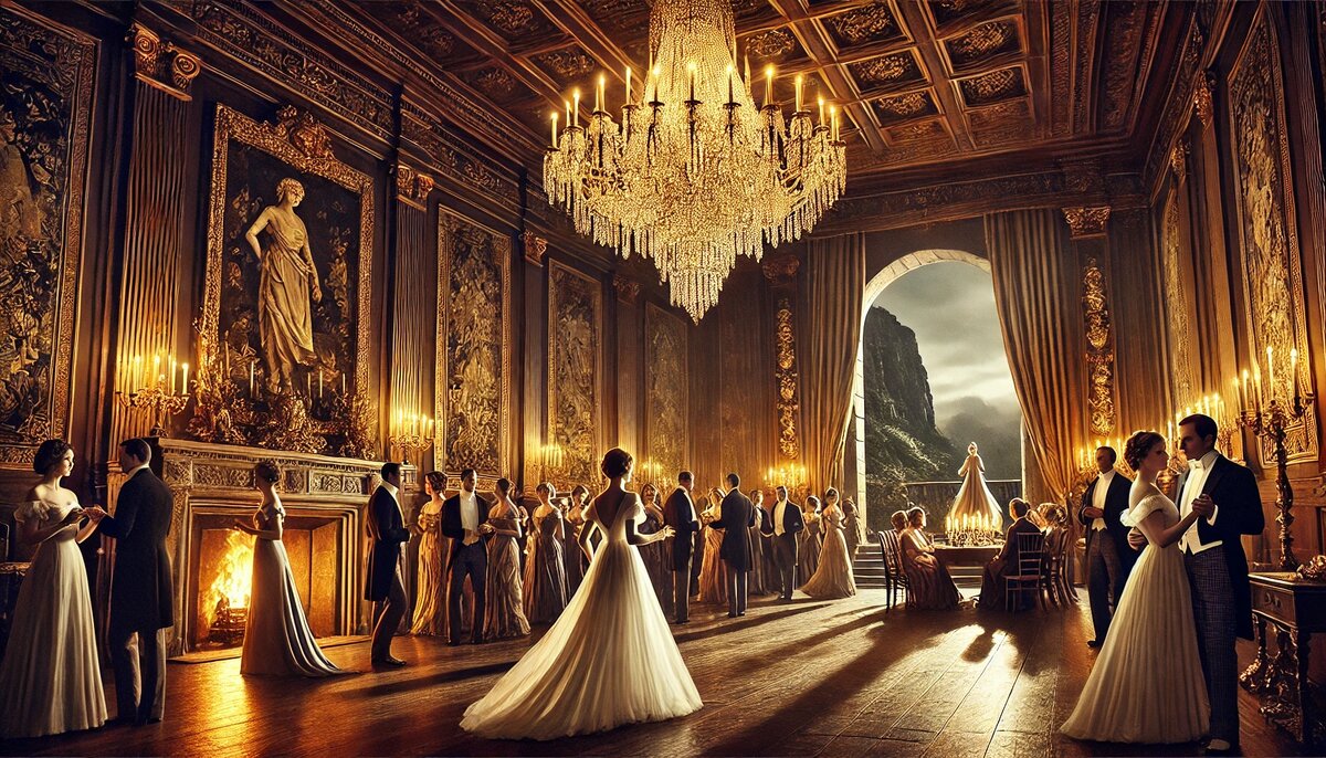 Шотландия, 1952 год. Музыка наполняла бальный зал, словно само время замерло в танце. Оркестр играл вальс, и дамы в длинных платьях кружились в объятиях своих кавалеров. Их смех был лёгким, почти пьянящим, растворяясь в атмосфере этого торжественного вечера. В камине потрескивали дрова, наполняя зал мягким золотистым светом, смешиваясь с отблесками множества свечей. Особняк Грэйсонов — величественный, с его вековыми гобеленами, позолоченными рамами картин и массивными люстрами, — в эту ночь был полон гостей. Это был один из тех вечеров, что заставляют забыть обо всём, кроме улыбок, лёгких бесед и музыки. Элизабет Грэйсон, самая юная из семьи, была звездой этого бала. В свои девятнадцать лет она источала редкую, природную красоту: лёгкие белокурые локоны, большие голубые глаза и озорная улыбка. Она ещё не утратила искренности юности, не научилась прятать чувства под маской приличий. Она смеялась, скользя между гостями, чуть кокетливо задевая плечом одного из молодых людей, затем, словно
