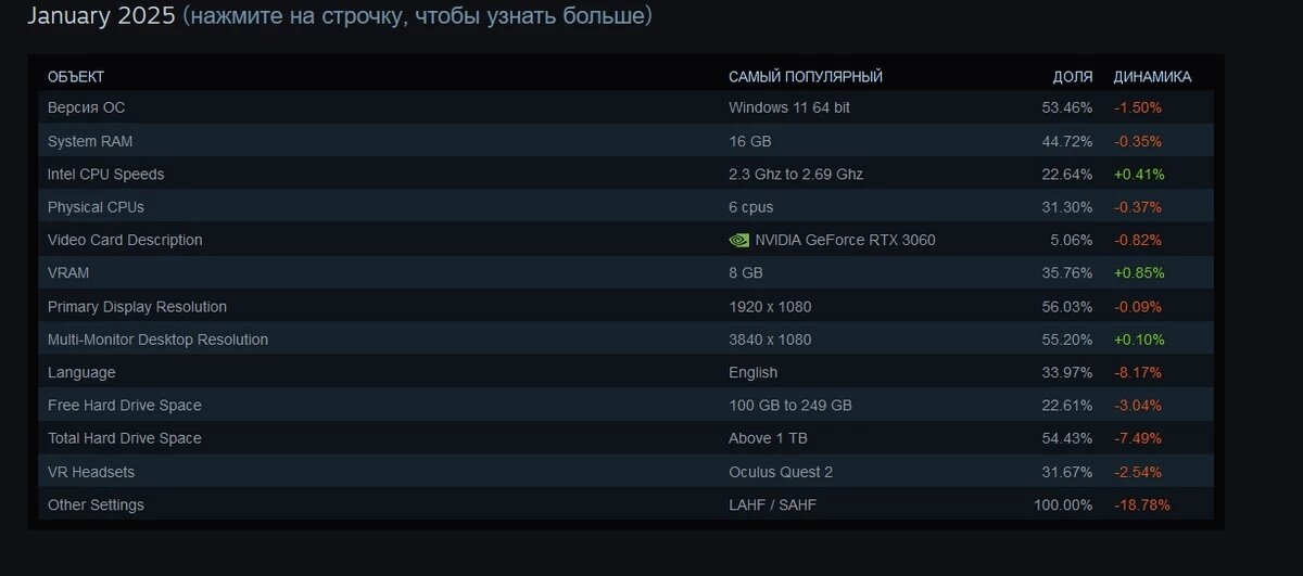 Steam опубликовал статистику геймерского железа за первый месяц 2025 года. Любопытно, что почти все лидеры немного потеряли в процентном соотношении по сравнению с декабрем. Так, пользователей Windows 11 стало на 1,5% меньше, а популярность видеокарты RTX 3060 снизилась на 0,82%. Зато выросло количество игроков на 4K-мониторах — на 0,10%. Но самое удивительное то, что вообще вся статистика видеокарт показала спад. Возможно, Steam в праздничный месяц просто меньше опрашивал игроков либо они не соглашались предоставлять статистику. Что касается видеокарт, то тут все стабильно: RTX 3060 первая, далее идет RTX 4060 для ноутбуков, а на третьем месте расположилась стационарная RTX 4060. В десятке только одна модель из серии GTX —1650. Она на четвертом месте по популярности.