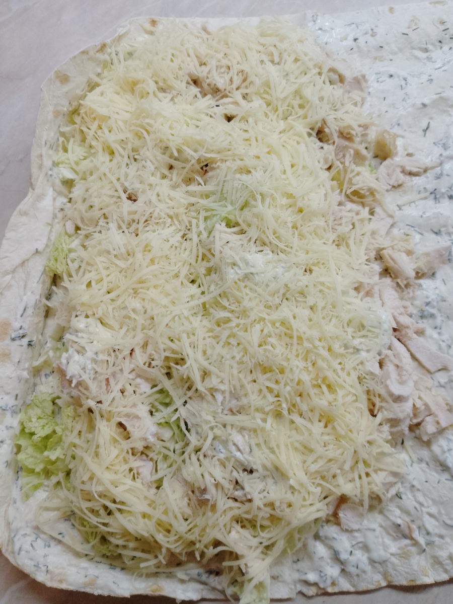 Моя старшая дочь очень любит салат "Цезарь" во всех его вариантах и видах. Сегодня предлагаю сделать рулет из лаваша по мотивам известного салата. Лаваш смазала сметанно-майонезным соусом с чесноком.( можно просто смазать лаваш майонезом). Тонко нарезала зеленую часть листьев пекинской капусты. Сверху на капусту мелко нарезанную куриную грудку. Еще не много соуса или майонеза. Посыпаем сыром на тертым на мелкой тёрке. Скручиваем рулет. Нарезаем на порционные кусочки и подаем на стол. Приятного аппетита! Готовьте с удовольствием! Удачи!