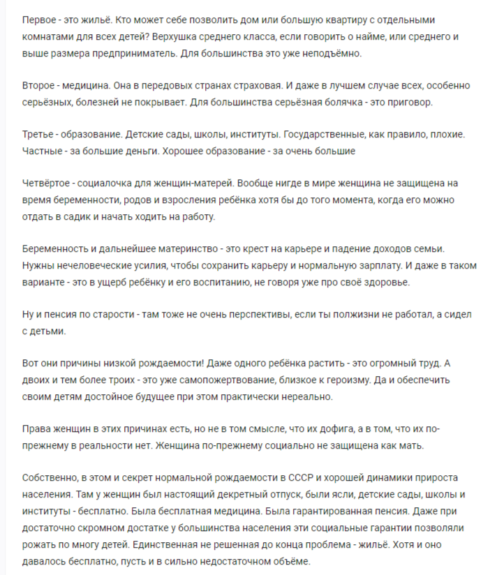 Сейчас очень модна демографическая тема и вопросы многодетности. Если зайти в любую тему, где обсуждают причину низкой рождаемости, то главной причиной обязательно будет низкий уровень жизни и некая стабильность, которую сильнее всего любят приплетать поклонники СССР