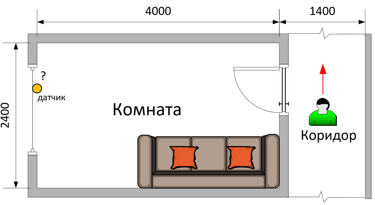 Допустим, у нас есть помещение с такими габаритами. Нам необходимо обнаружить человека, который проходит мимо ЗАКРЫТОЙ двери в комнату.