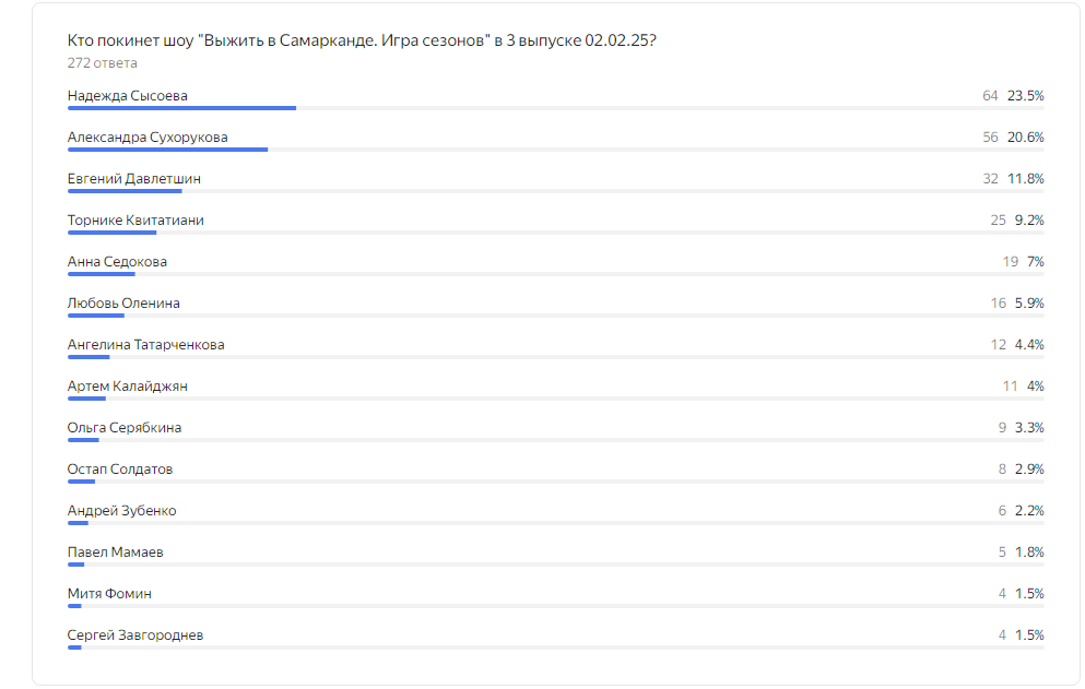 Видно, что по мнению моих читателей, сегодня по любому должны уйти двое: Надя Сысоева и Саша Сухорукова. Эти две не всем приятные Мадам лидируют в голосовании.