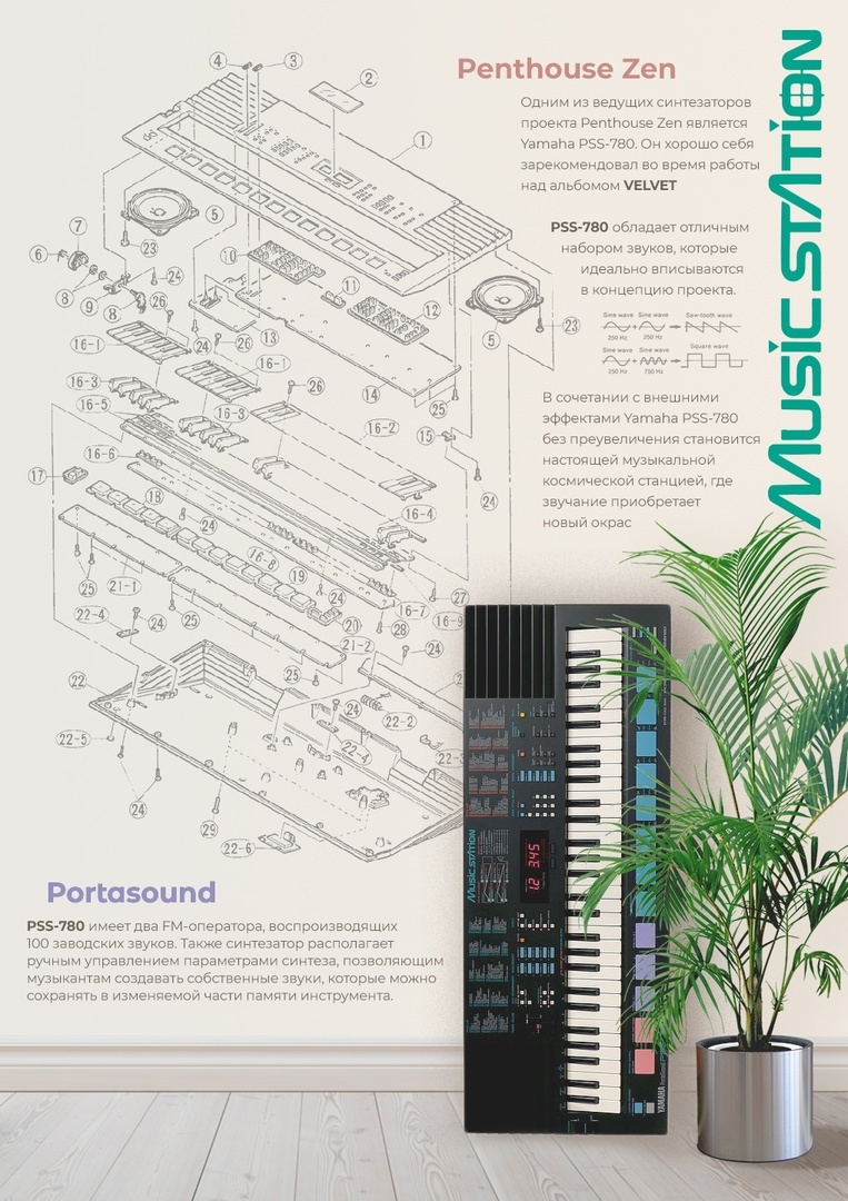 Yamaha PortaSound - серия портативных клавишных инструментов. Многие из них были разработаны для обучения игре детей - они имели уменьшенные клавиши (в отличии от серии PSR) и обладали простыми функциями. Всего в линейке PSS чуть более полусотни моделей - они выпускались в течение десяти лет с 85 по 97 годы прошлого века. Синтез в основном был основан на сэмплах (Sample-based synthesis), но встречались и модели с типом синтеза Wavetable, FM и Basic shapes. Congratulations on your purchase of the Yamaha PortaSound PSS-780! PSS-780 - это двух-операторный FM синтезатор с возможностями сохранения до пяти пользовательских тембров (голосов). Сразу «из коробки» инструмент обладает 100 предустановленными голосами и универсальной драм-машиной с 32 звуками ударных и сотней шаблонов в семи музыкальных стилях (рок, поп, соул и др.) Синтезатор оснащен MIDI (IN / OUT / THRU), стереовыходом, выходом на наушники и парой динамиков (по 2 ватта). Подключение педали не предусмотрено. Работает автономно (о