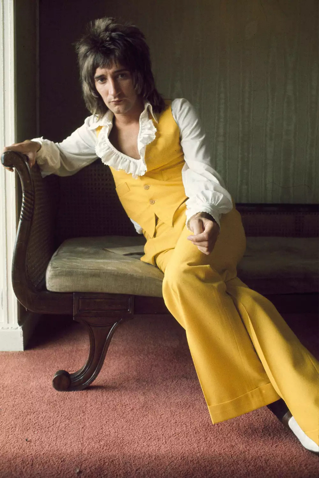 Род Стюарт, один из самых известных и успешных музыкантов в истории, прославился не только своим голосом, но и уникальным стилем. В 1970-х годах он стал настоящей иконой моды, объединив в своём образе элементы глэм-рока, богемного шика и изысканности. В то время как другие музыканты носили обычные джинсы и футболки, Род Стюарт предпочитал узкие, сшитые на заказ костюмы. Он выбирал смелые узоры, такие как полоски, клетка или металлизированная отделка. Лацканы и брюки с высокой талией придавали его образу утонченный, но бунтарский вид. Род принял эстетику глэм-рока и носил расшитые блестками пиджаки, атласные рубашки и металлизированные ткани. Эти материалы ловили свет сценических огней и делали его выдающимся исполнителем. Расклешенные рубашки с открытыми воротниками и шарфы, свободно завязанные вокруг шеи, стали его фирменным стилем. Они придавали его нарядам непринужденный, романтичный оттенок. Стюарт часто включал в свой гардероб элементы богемы, такие как бахромчатые куртки, замша и