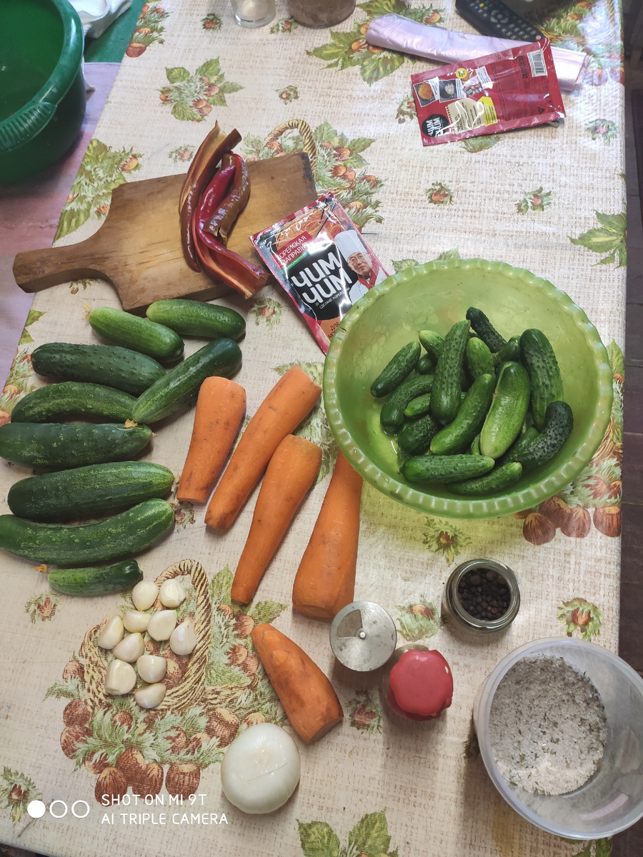 Здравствуйте дорогие читатели сегодня попробуем рассмотреть мое предложение по приготовлении овощной закуски в автоклаве. Бывает приятно залезть в кладовку и взять там баночку с овощами , что бы быстро приготовить закуску или гарнир к приходу неожиданных гостей и при этом удивить их необычным блюдом. Так же неплохо эта закуска идёт когда друзья собираются посидеть у тебя в гараже или на даче проведя отличное время за рюмочкой великолепного крепкого напитка. Итак начнем нам понадобится огурцы 1,5 кг , лук 2 штучки , морковь 1 килограмм ,чеснок 10 долек стручковый перец средней остроты штук 3-4, соль по вкусу, черный перец , некоторые специи, которые вы любите и заправку для корейской моркови. Всё хорошо моём ,очищаем лук и чеснок, морковь режим на полоски небольших размеров и вылаживаем на сковородку немного потушить до полуготовности . Нарезаем овощи средними кусочками солим , перчим по вкусу , смешиваем с морковью и добавляем заправку для морковки по корейски. Всё снова перемеш
