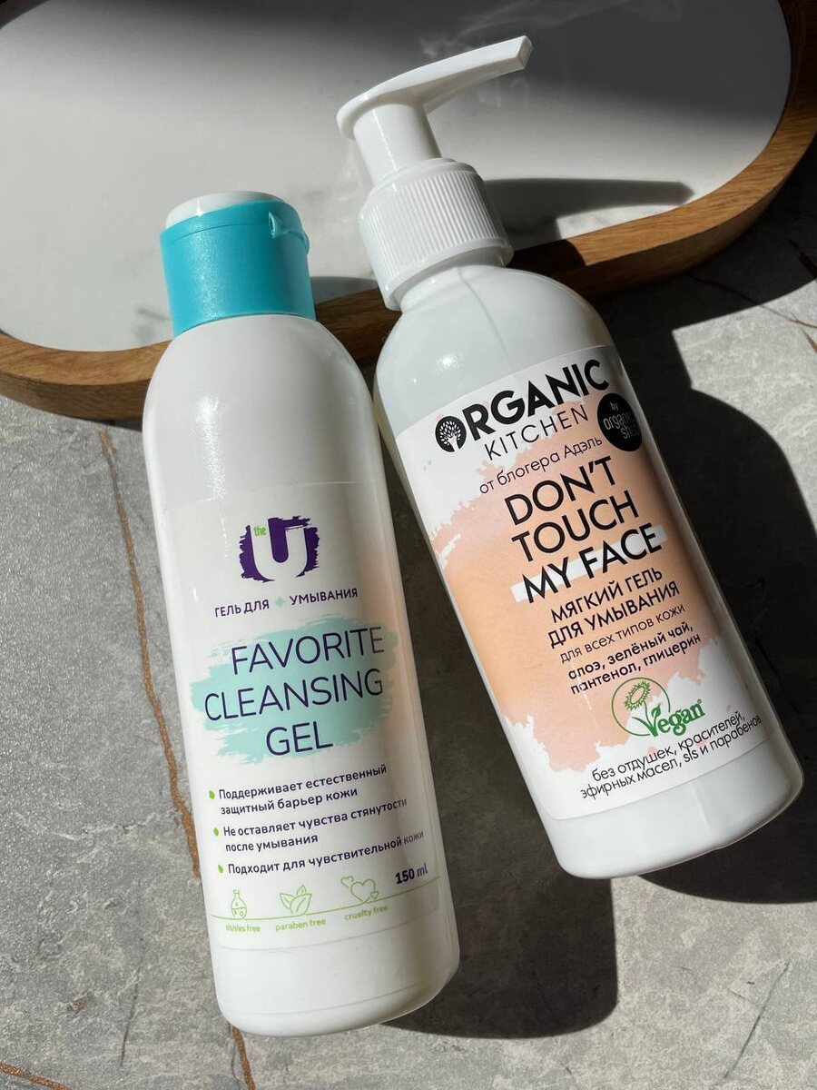 Представляю вашему вниманию - два базовых геля для умывания на мягких ПАВах, которые деликатнейшим образом очищают кожу не до «скрипа» 👇🏻 • Organic Kitchen x DTMF - жидкая текстура без отдушек абсолютно, не пенится. В составе: алоэ-вера, зеленый чай и пантенол. Подойдет всем типам кожи, включая чувствительную. 300₽ • The U Favourite Cleansing Gel - текстура геля, которую при желании можно даже немного вспенить. В составе: алоэ-вера и растительные экстракты. Подойдет всем, кроме чувствительной кожи (во всем винить яркую отдушку). 600₽